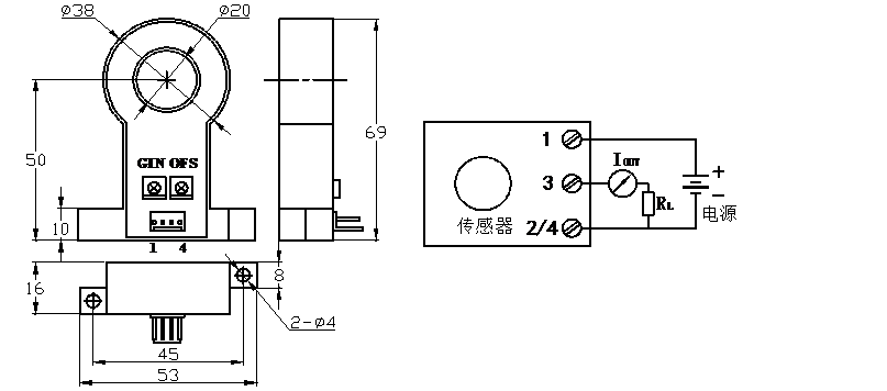 引腳說明:1,+24V2,0V(電源地)3,IOUT4,0V(電源地)OFS,零點調節GIN,幅度調節
