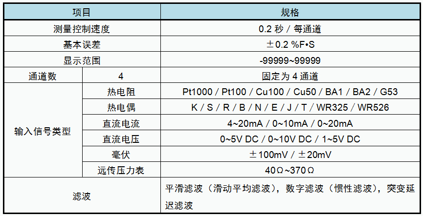 標準配置4路輸入;0.2級顯示精度;測控速度(0.2秒 × 通道數) |