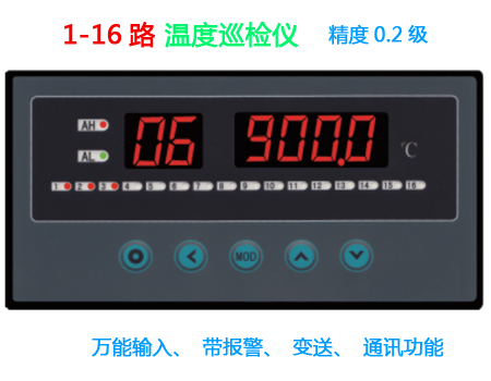 16路溫度巡檢儀:順序巡回測量16路輸入信號,測量的結果放在數據緩沖區,供顯示和通訊使用。16路萬能輸入信號,帶2點報警點、可配通