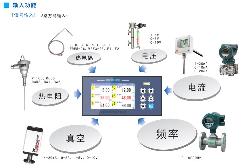 輸入信號:熱電阻、熱電偶、電壓、電流和頻率等。