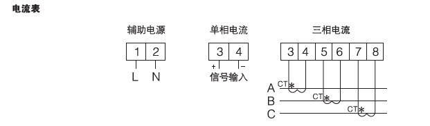 標準輸入電流:0-1Adc、0-5Adc.大于5A的情況應使用外部CT,通過CT擴展量程設置,訂貨時說明)